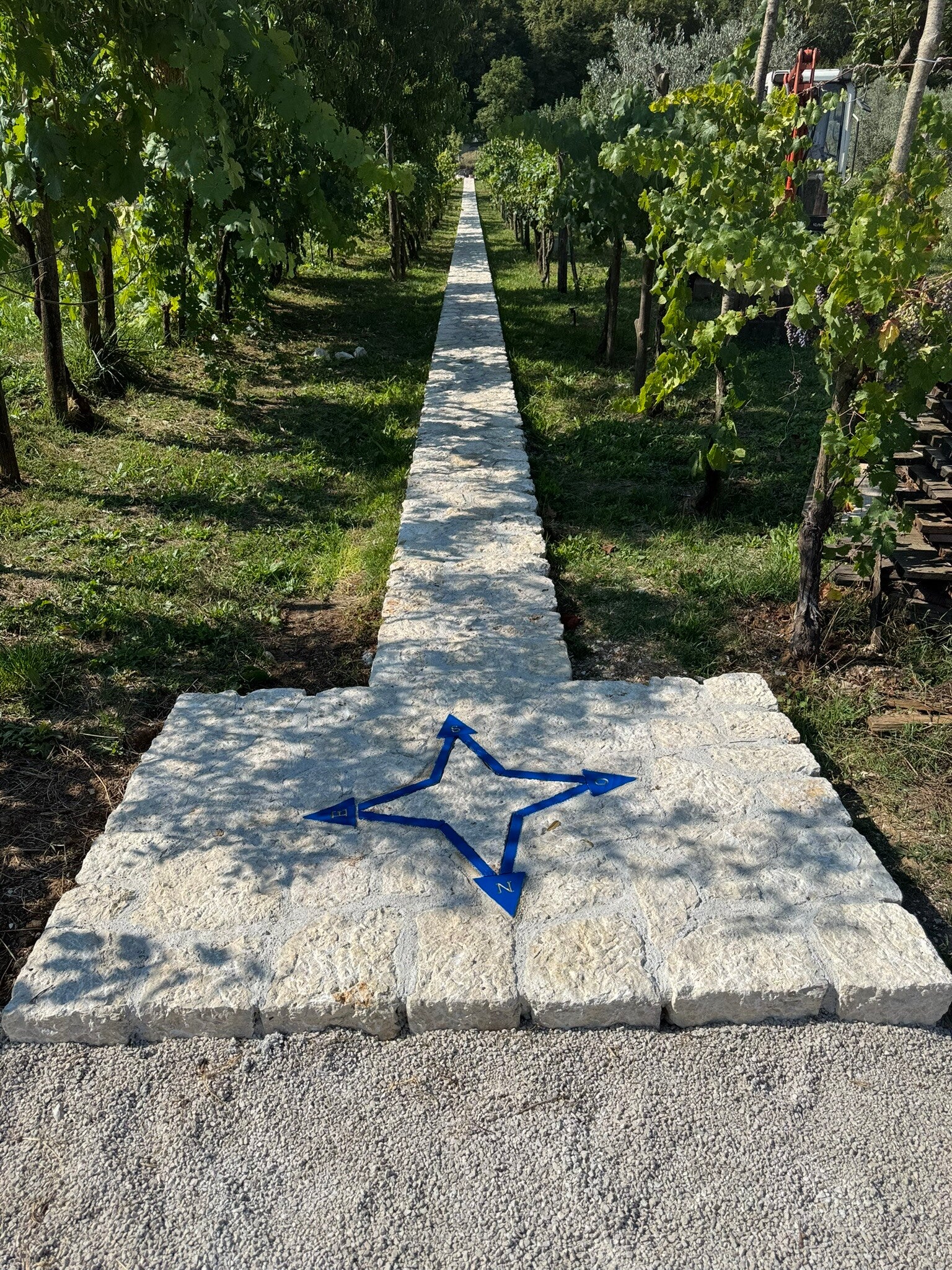 A natural stone path almost 80m long is still under construction, leading from the country house to the Observatory. It is a path raised about 15cm above the ground avoiding any contact with grass and mud on rainy days. It passes between two wonderful rows of vines. The cardinal points are drawn on the small platform that marks the beginning of the natural stone path.