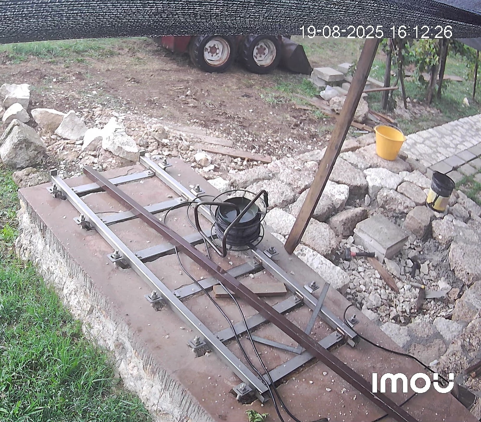 The rails have been placed. Looking carefully at the photo you will notice that there are a pair of external rails and a pair of internal rails, both fixed to their respective concrete platforms. However, in order to allow the opening and closing of the side door, the system provides for the easy manual insertion of a third pair of rails that connects to the previous ones. A system of threaded rods anchored to the external platform with a nut and counter nut allows the pair of fixed external rails to be perfectly levelled, thus enabling perfect coupling with the "moving rails". The photo also shows in the background the main optical tube on the column in the parked position.