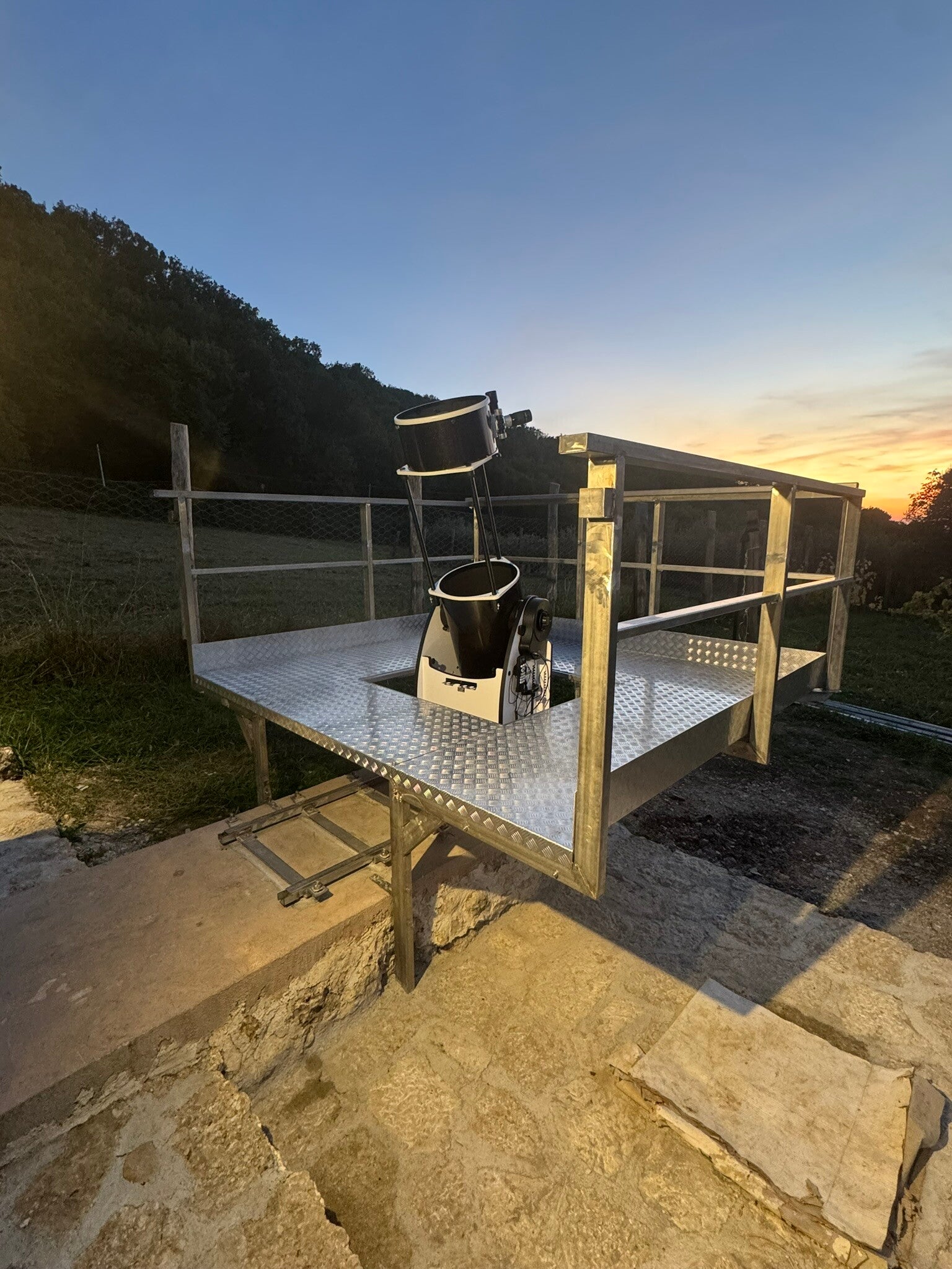 It's time to assemble the Astronomical Roll-Off Shelter on the reinforced concrete platform. The supplier came with 3 workers to assemble all the parts previously made in the workshop. No welding on site, all metal surfaces were pre-treated and bolted on site to avoid any risk of rust over time.