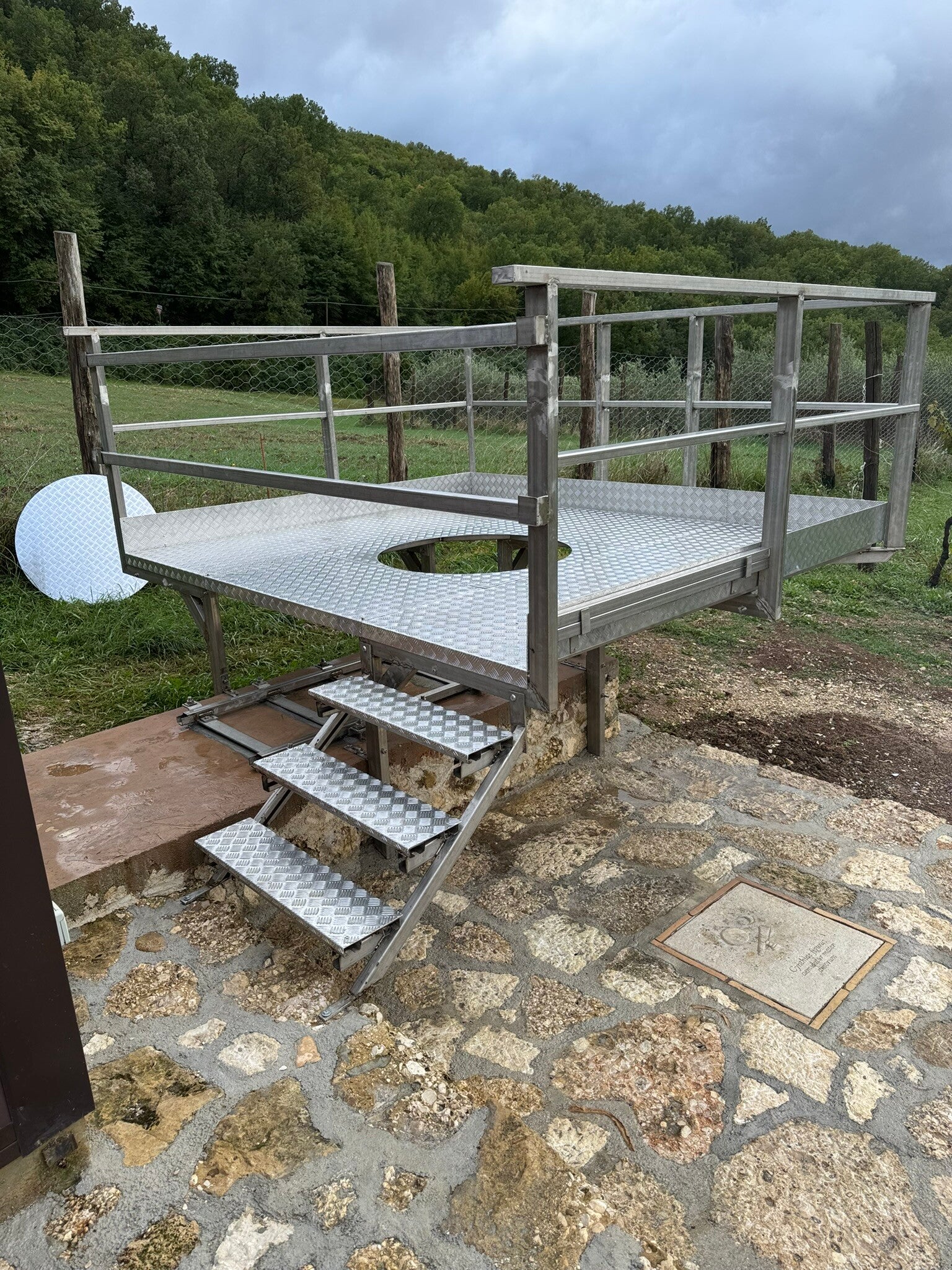 Construction of a very strong and safe stainless steel structure with an alluminium pavement that allows easy access to the Dobson telescope eyepiece once it has been extracted from the observatory via the trolley on guides and positioned on the external platform.
